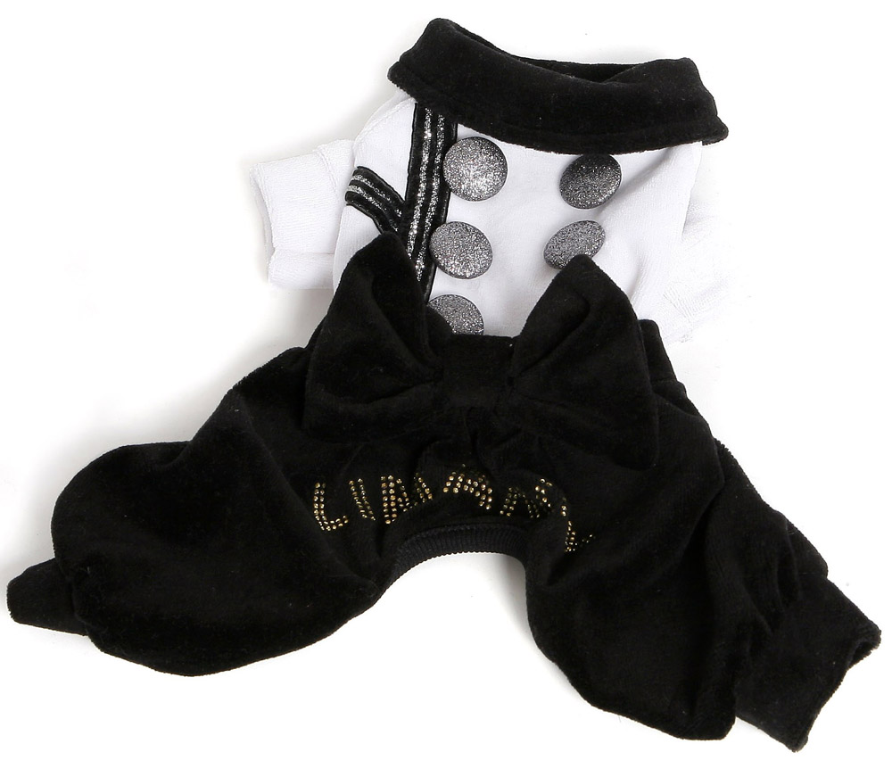 Комбинезон с большим бантом на попе и серебристыми пуговками на спинке, на попе так же надпись из страз LIMARGY, так же костюмчик украшен бархатной тесьмой. Штаны выполнены шароварами.