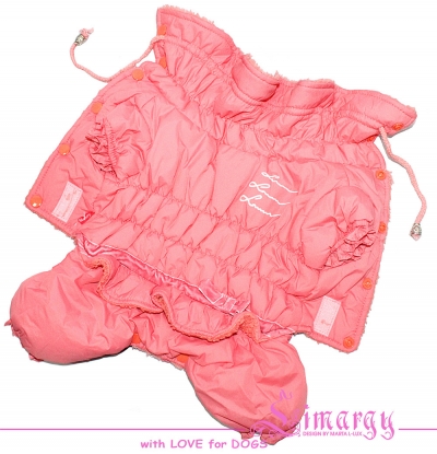 Практичный и очень теплый комбинезон на холодную зиму. Спинка украшена аппликацией в виде бархотной ленты с бантом и надписями. Воротник - стойка, расширенный с верху. Данная модель выполнена с закрытым животом, что очень актуально для девочек, данная накладка регулируется по длине, для мальчиков просто отстегивается. Застежка - клепки, Внутри - мягкий плюш