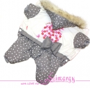 Практичный и теплый комбинезон на холодную зиму. Спинка украшена аппликацией. Капюшон украшен мехом, капюшон фиксируется на спине клепкой, на талии - большой объемный бант, также регулировка по длине. Застежка - клепки, Внутри - мягкий плюш.
