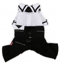 Модный строгий костюм для настоящего "мужчины", костюм - тройка: рубашка, жилетка и брюки, брюки выполнены комбинезоном, лямки и объем талии регулируются на пуговицах, жилетка так же регулируестя с помощью пуговиц, также жилетка украшена черными бархатными бантиками, лже-кармашками и белым платочком. Воротник и манжеты рубашки украшены бархатной лентой и аппликацией из страз на одном из рукавов. Брюки и жилет украшены дорожками из страз.